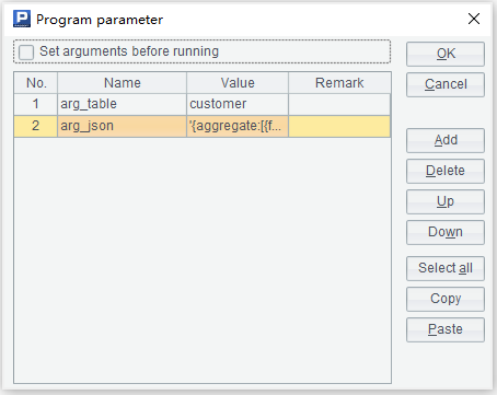 We first call customer.dfx in olap.dfx to parse json string and then operate OLAP calculation. The parameters of olap.dfx are arg_table and arg_json: