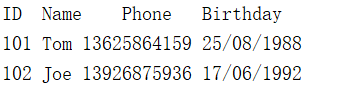 =file("d:/txt/empinfo.txt").import@t(ID,Name,Phone:string,Birthday:date:"dd/MM/yyyy")