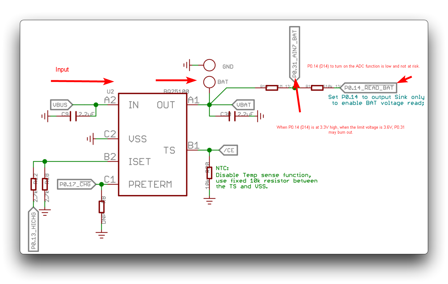 i am confused with the pin layouts but in the schematics P0.31 is the input to read the battery level and in FAQ Q3 P0.14 should be (ADC_BAT) analoginput or digital low |