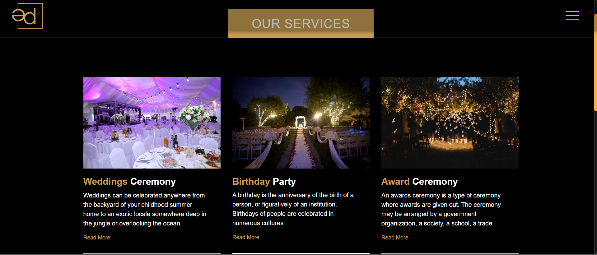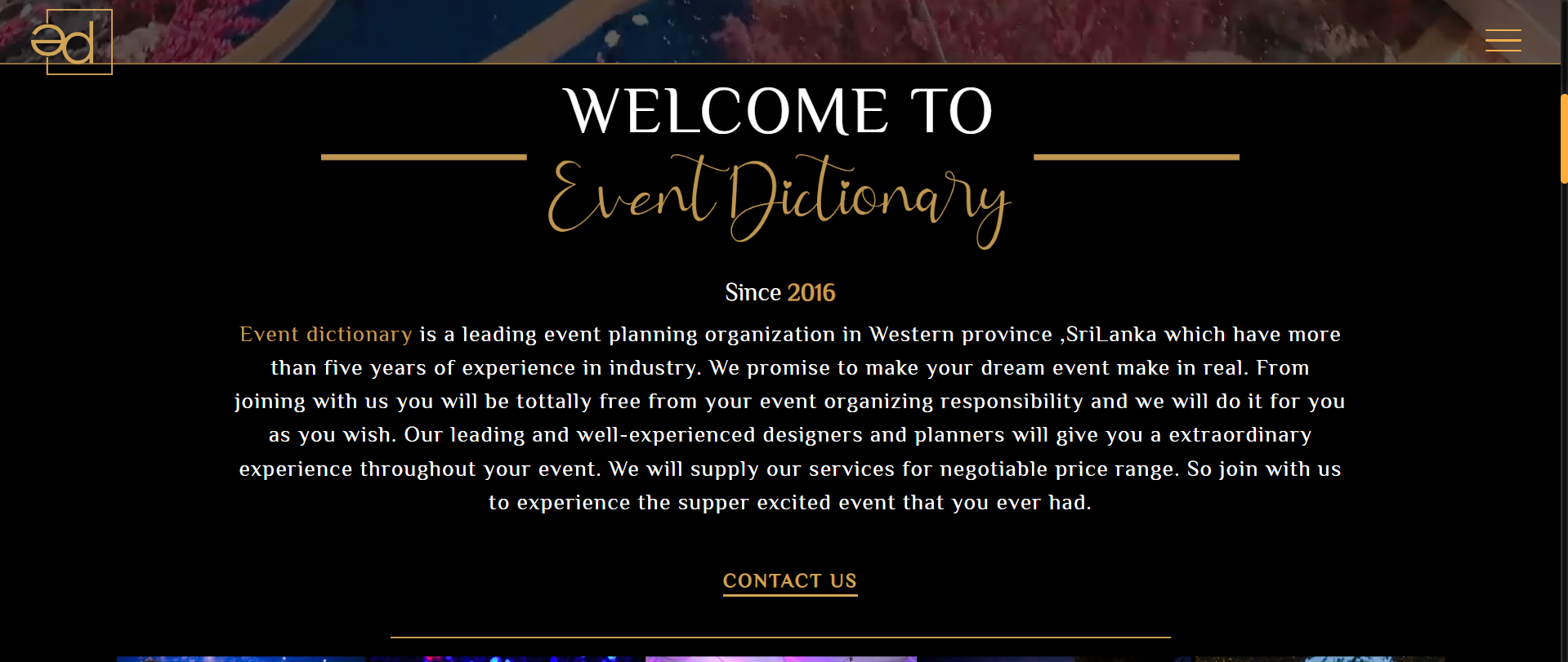 Event Dictionary is a web based event planning system which is developed using HTML,CSS and PHP. This is a fully completed project with the control panel . This web site contains with functions such as Customer login,Admin log in, Event Book form,Sending contact request, sending Customer review etc.