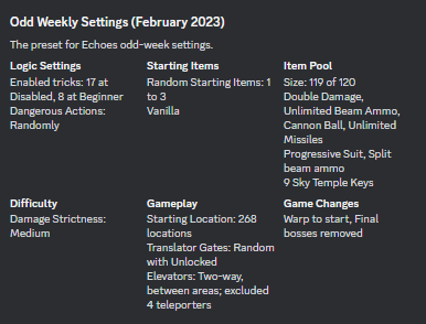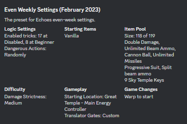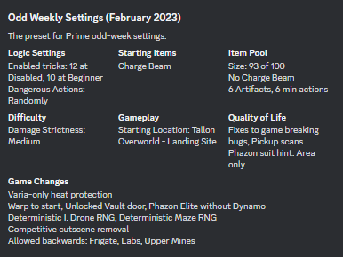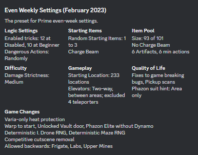 Current presets for all Prime/Echoes/CGC weeklies as of August 2024. Includes the updated naming conventions of Standard/Alternate presets for Prime and Echoes (formerly Odd/Even).