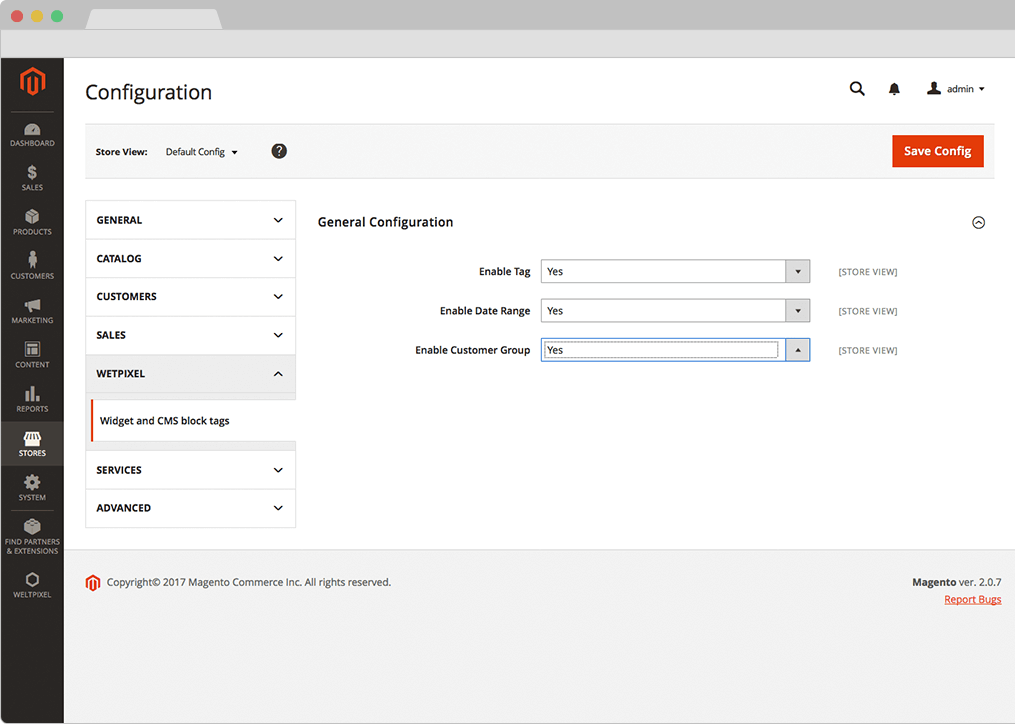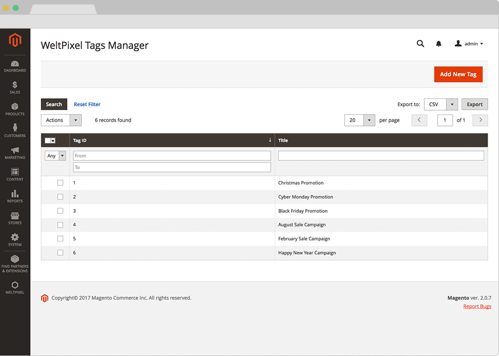 - The list of Tags can be found in Admin ->WeltPixel -> Manage Tags