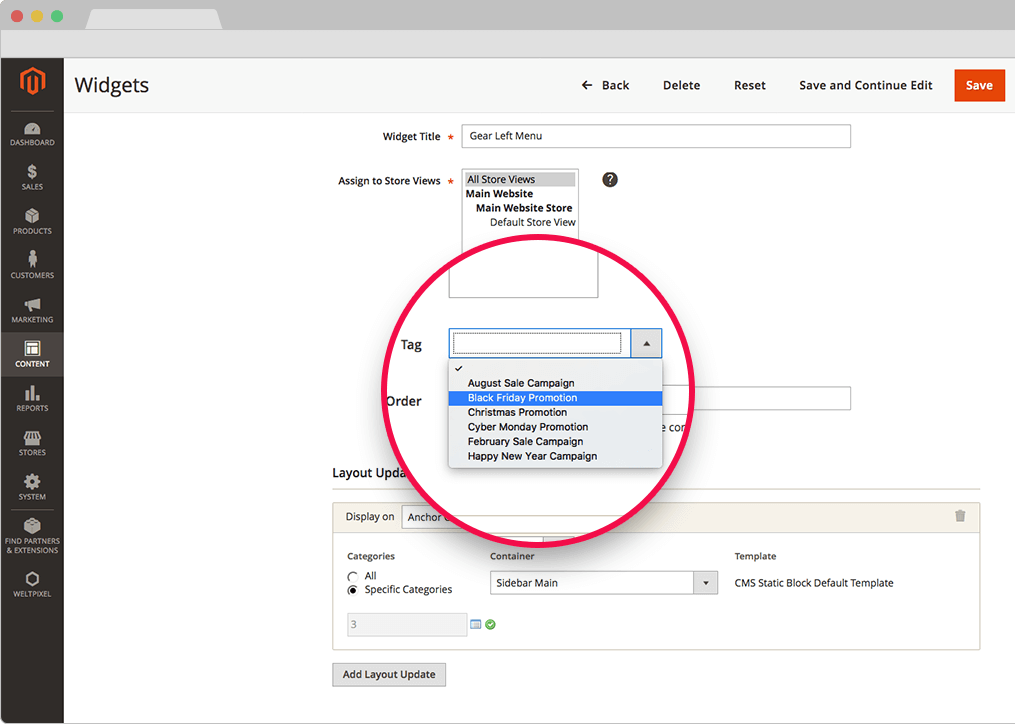 - In Admin -> Content -> Widget select the widget to be Tagged and select from a tag previously created in 'Manage Tags' section of the extension.