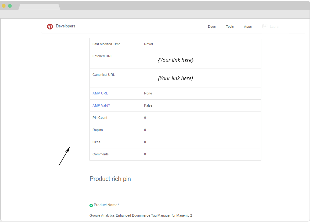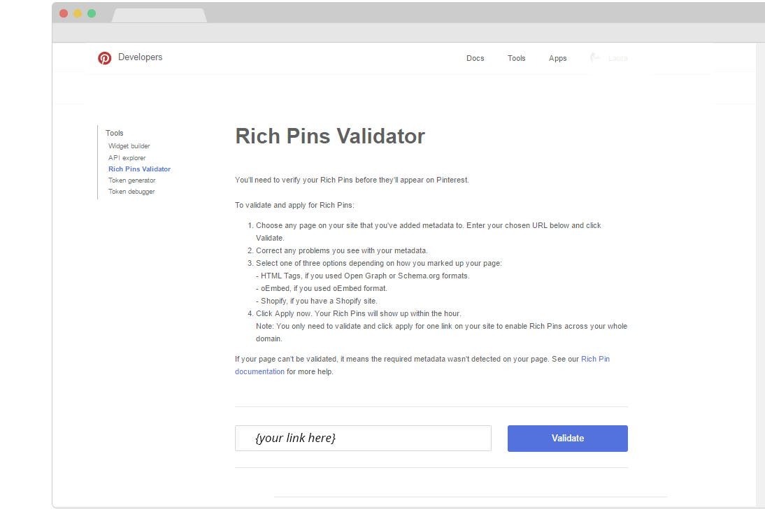 Note: Do not forget to login to Pinterest for the Pinterest Rich Pins Tool to work