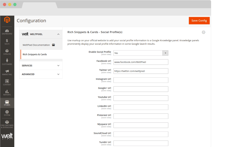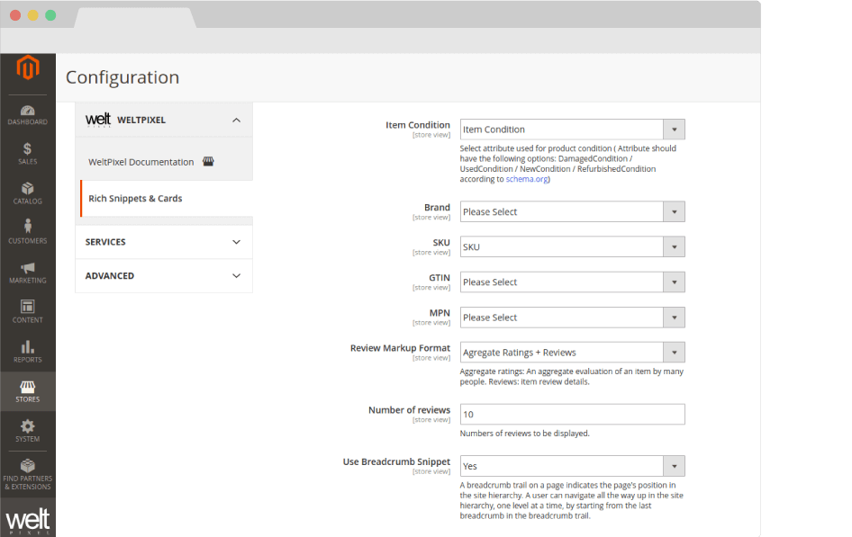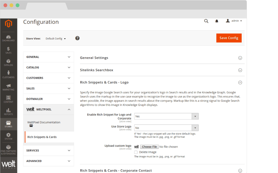 Go to Admin > WeltPixel > Rich Snippets & Cards > Rich Snippets & Cards Logo: