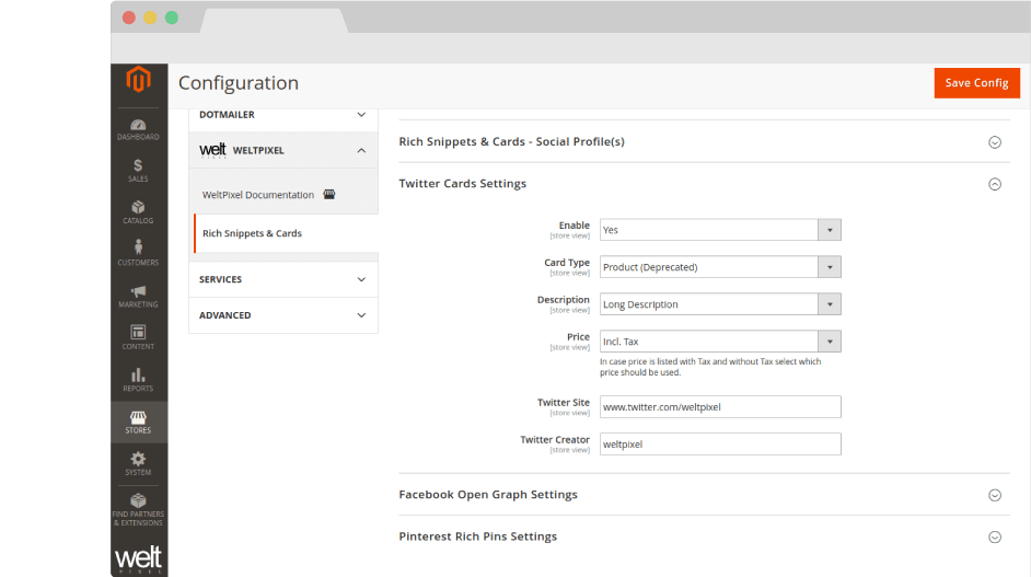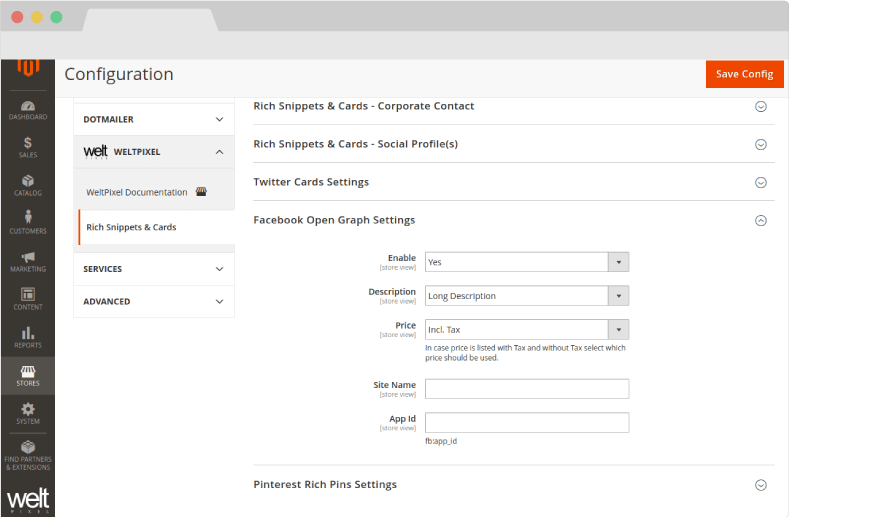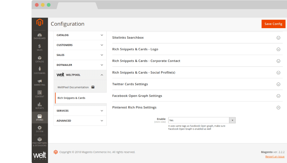 - Go to Admin > WeltPixel > Rich Snippets & Cards > Pinterest Rich Pins Settings and set the Pinterest Rich Pins: