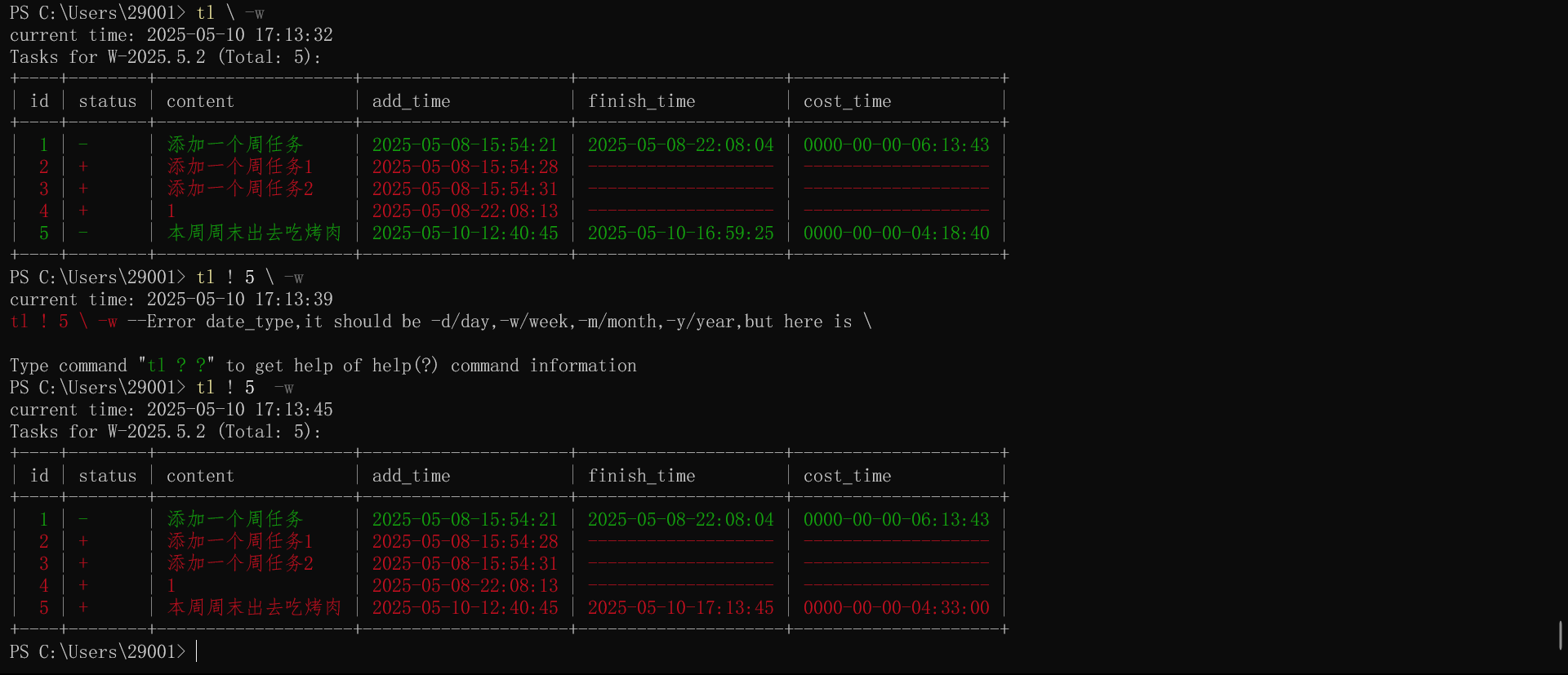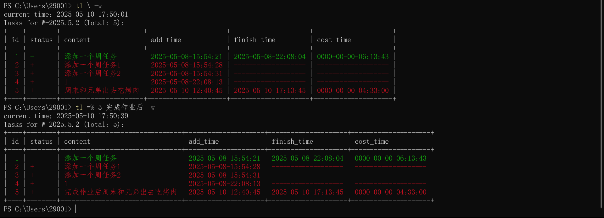 | tl! tid -w 2025.06.01 | 切换2025年6月第1周任务列表中id为tid的任务状态 |