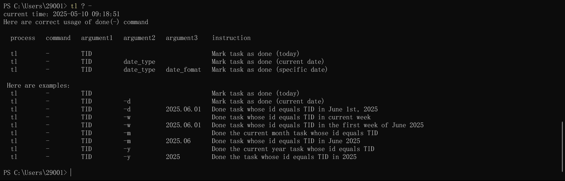 | tl - tid -d 2025.06.01 | 标记2025年6月1日任务列表中id为tid的任务为已完成 |