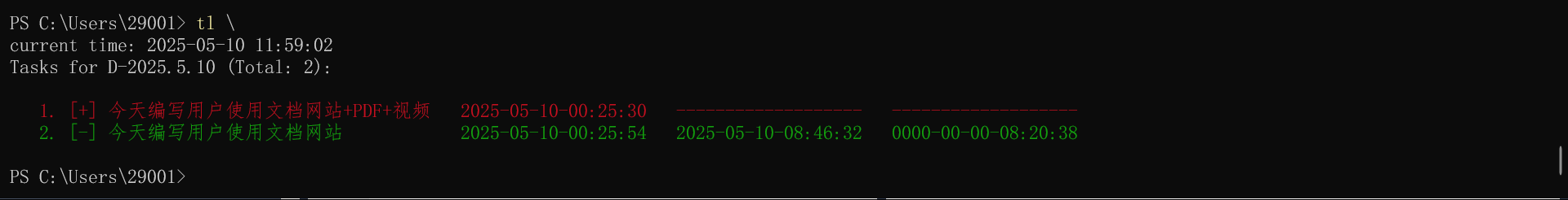 | tl \ -d 2025.06.01 | 显示2025年6月1日任务 |