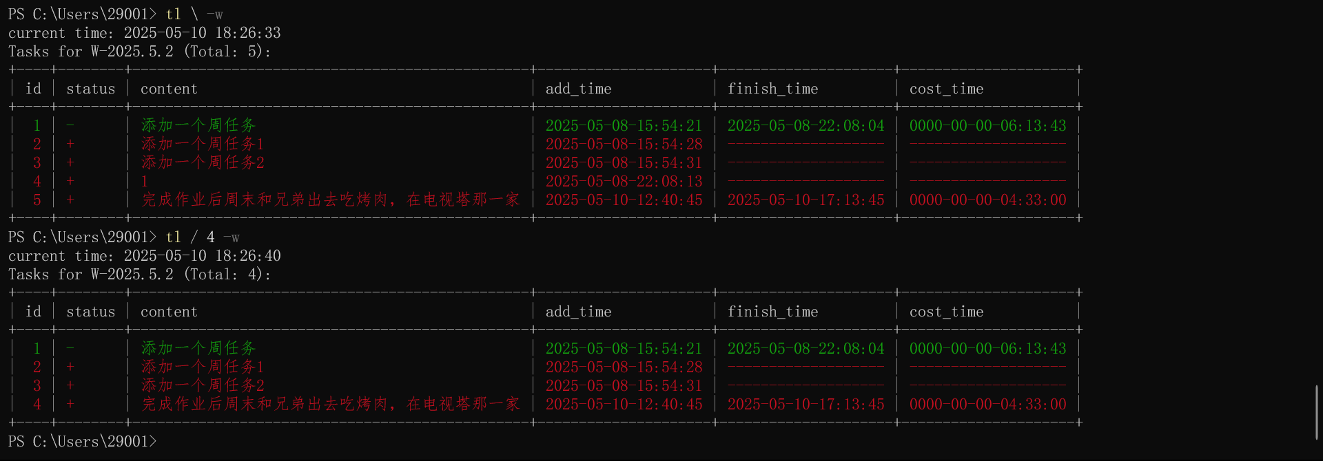 | tl / tid -w 2025.06.01 | 删除2025年6月第1周任务列表中id为tid的任务 |