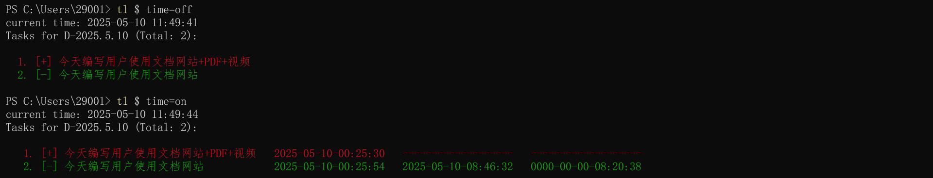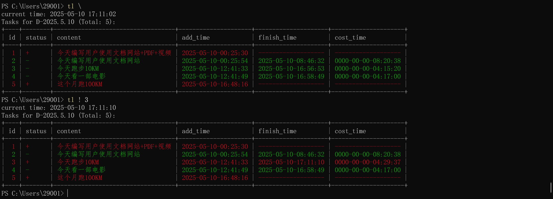 | tl! tid -d 2025.06.01 | 切换2025年6月1日任务列表中id为tid的任务状态 |