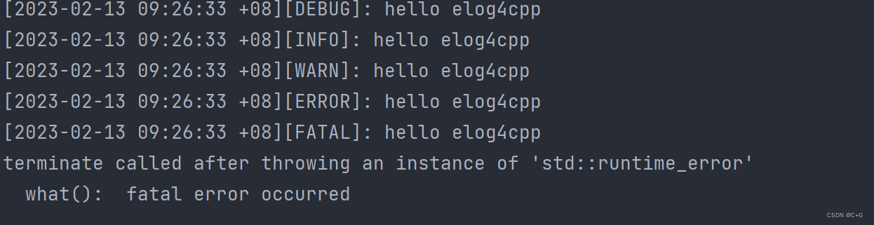 #define ENABLE_ELG_LOG #include <elog/logger.h> using namespace elog; int main() { GlobalConfig::Get() .setFilepath(". /log/") .setLevel(Levels::kTrace) .setFormatter(formatter::colorfulFormatter); ELG_TRACE("hello elog4cpp"); ELG_DEBUG("hello elog4cpp"); ELG_INFO("hello elog4cpp"); ELG_WARN("hello elog4cpp"); ELG_ERROR("hello elog4cpp"); }