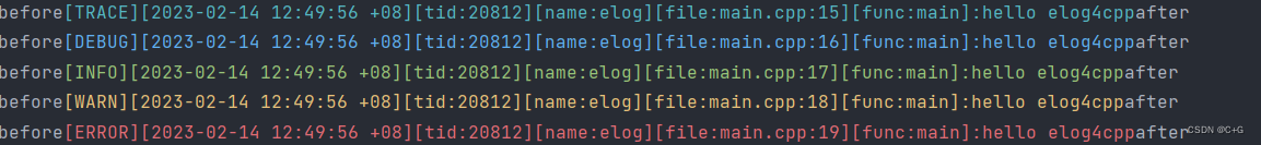 GlobalConfigmethod.#define ENABLE_ELG_LOG #include <elog/logger.h> using namespace elog; int main() { GlobalConfig::Get() .setRollSize(4) .setFlushInterval(3) .setFilepath(". /log/") .enableConsole(true) .setFlag(kStdFlags + kThreadId) .setLevel(kTrace) .setName("elog") .setBefore([](output_buf_t& buf) { buf.append("before"); }) .setAfter([](output_buf_t& buf) { buf.append("after"); }) .setFormatter(formatter::customFromString("%c[%L][%T][tid:%t][name:%n][file:%F][func:%f]:%v%C")); ELG_TRACE("hello elog4cpp"); ELG_DEBUG("hello elog4cpp"); ELG_INFO("hello elog4cpp"); ELG_WARN("hello elog4cpp"); ELG_ERROR("hello elog4cpp"); }