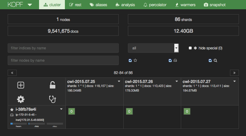 The CloudFormation template also installs the kopf plugin which allows you to monitor and manage your Elasticsearch cluster from a web interface.