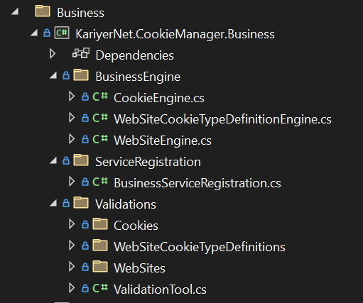 The business layer is built on the data layer, there are classes that will provide CRUD operations for each entity, these classes are the repository classes in the data layer, unlike Data Object Transfer classes are taken as parameters or returned objects, these objects contain variables that will be required for the client. , so we do not get or return all the attributes of the entities, the parameters of the related ODT objects are validated with the validate classes in the addition and update processes, and after validation, the repository classes in the data layer are used. To make these more clear, let's examine each project in the tier.