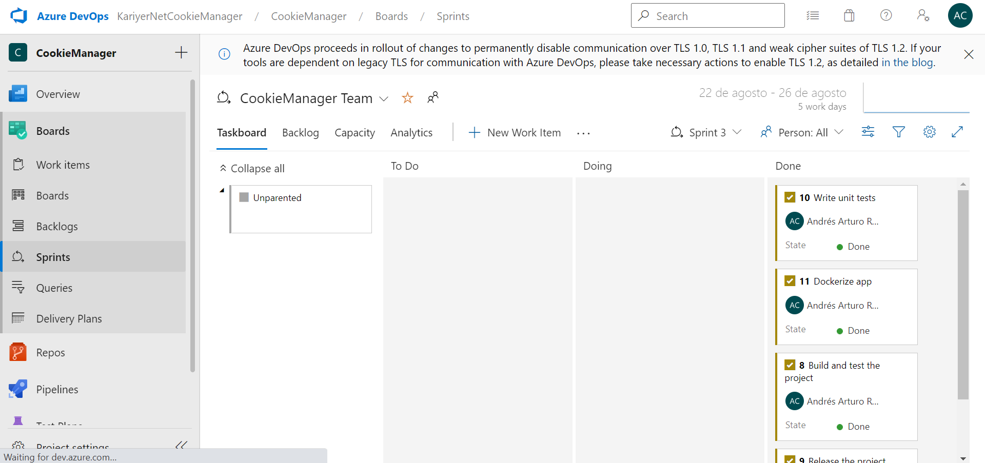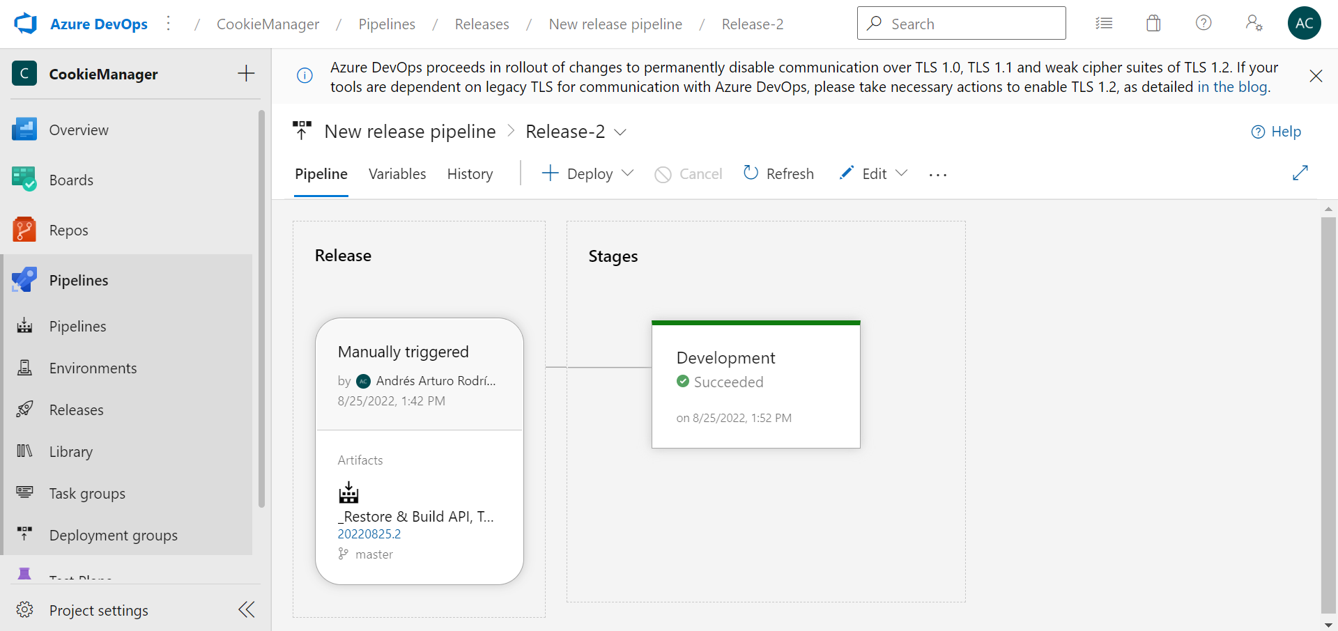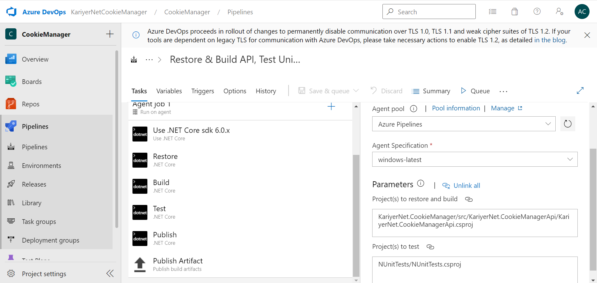 After the processes, the pipeline was created for the CI process of the application, this pipeline provides the application to install, build and run the NUnit Tests, the relevant pipeline can run automatically when any new code change is made, it helps to control the application very quickly.