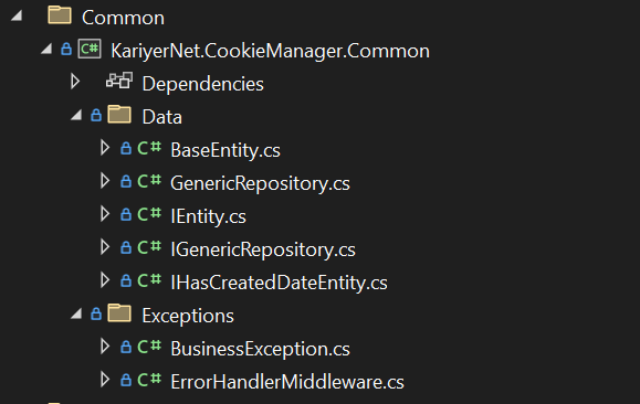 IGenericRepository interface will have methods to be used in all repository, these methods will be related to CRUD operations. Considering that different technologies can be used in the future, the interface has been created for now. The methods of the GenericRepository class interface will be implemented, since it is working with Entity Framework, EF methods are included in its methods. The CookieRepository class is a subclass of the GenericRepository class, inheriting all the methods of its superclass. ICookieRepository interface implements IGenericRepository interface, here we can write additional methods, then these methods will be implemented by CookieRepository, ICookieRepository helps us to know additional written methods easily, code readability and principles preservation of classes are increased. We'll talk about this again later when we talk about the Common layer.