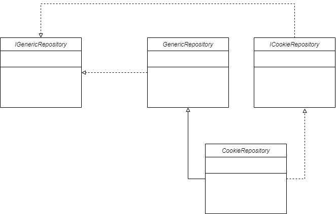 The class is a subclass of the GenericRepository class, it also implements the ICookieRepository interface, its constructor takes a context, it has a context variable that it uses in common with GenericRepository subclasses, the context taken in the constructor will replace this variable, so with the base keyword We call the constructor in the super class and thus we set the common variable. We will examine the related super class and interface later, so we will not go into further details. Finally, it should be said that these applied class distinctions allow the addition of new methods easily. To better understand this, let's examine the UML diagram that contains only the relevant classes, since I will only use the picture to describe this situation, methods and variables will not be included in the diagram.