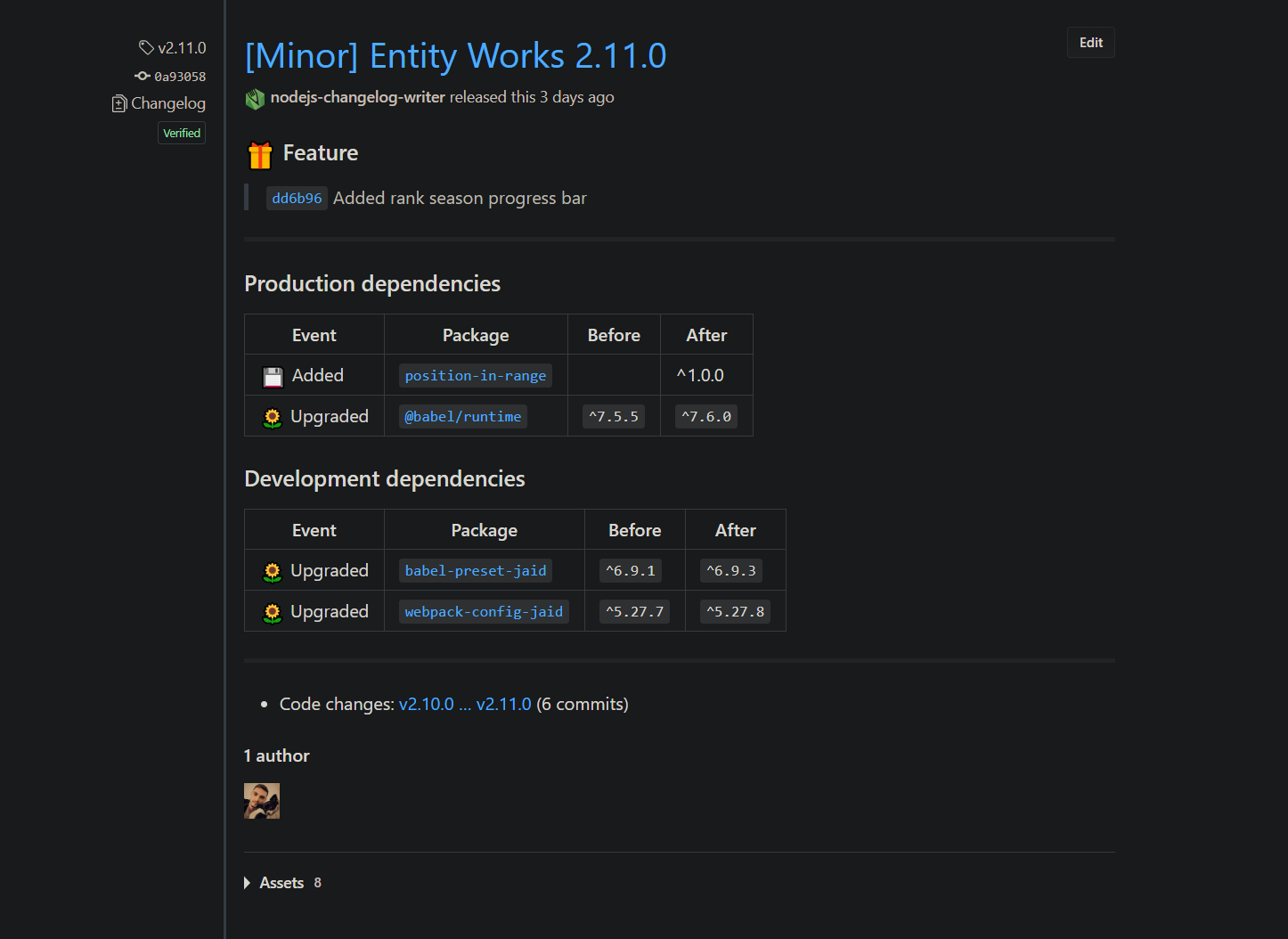 }Whenever the version from the package.json file gets increased, this extension creates a tag (v1.2.4 for example) and a release that lists code and dependency changes made since the last tag.