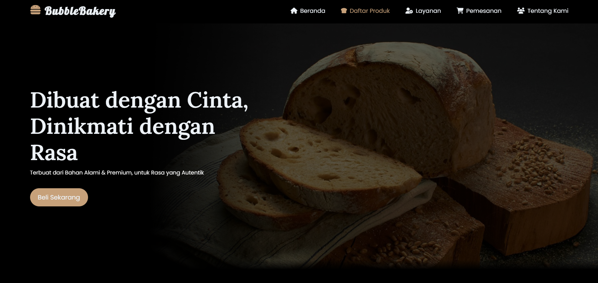 BubbleBakery adalah web landing page untuk Toko Roti. Website ini menampilkan berbagai jenis roti dengan gambar beserta harganya. Pengunjung dapat menjelajahi produk dan melakukan pemesanan dengan mudah melalui tombol "Beli Sekarang" yang mengarahkan mereka ke WhatsApp.