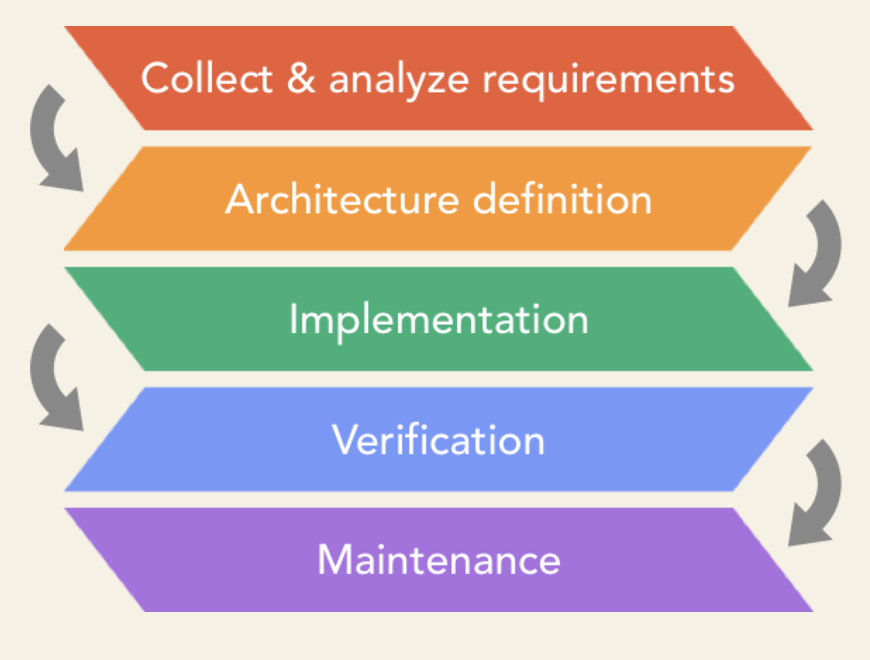 The development process flows in cascades. Each development phase requisites the previous one to be completed. Let's talk a bit about these phases.