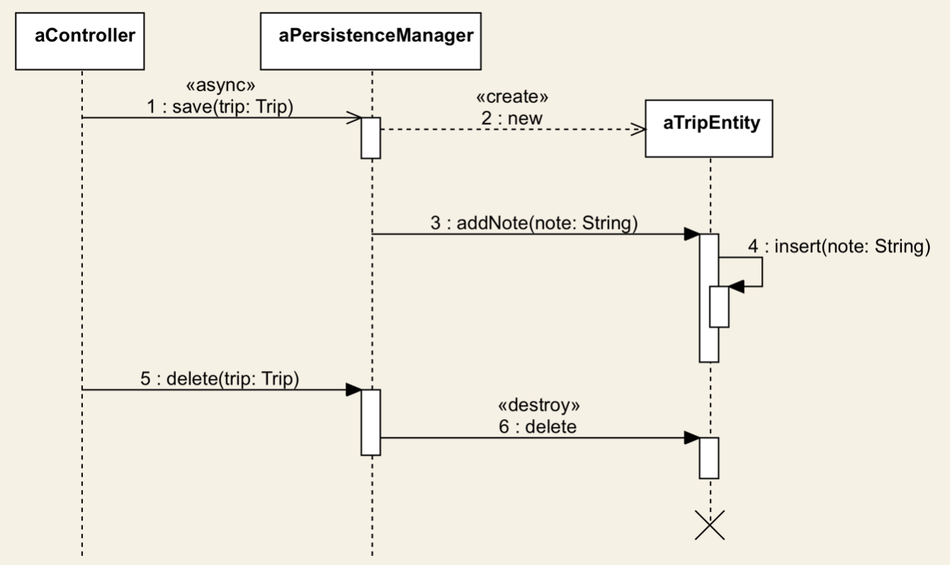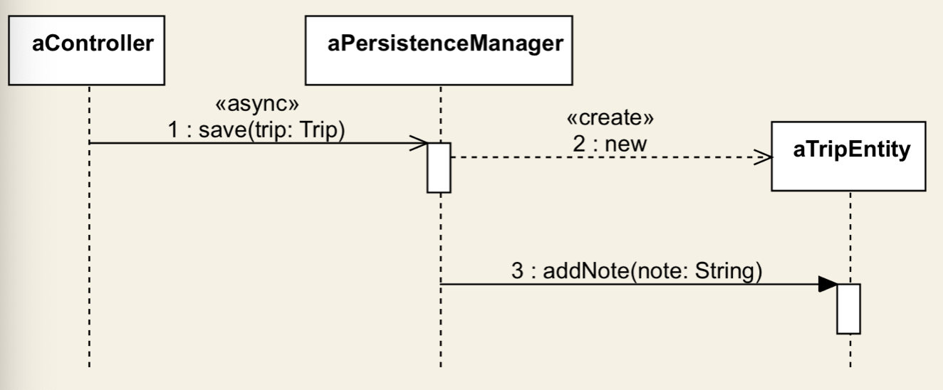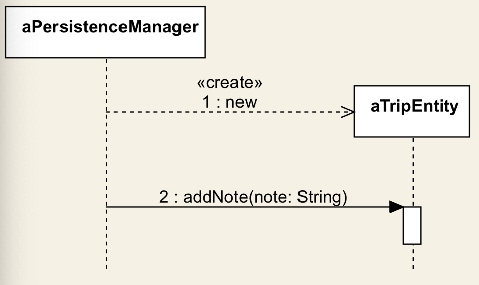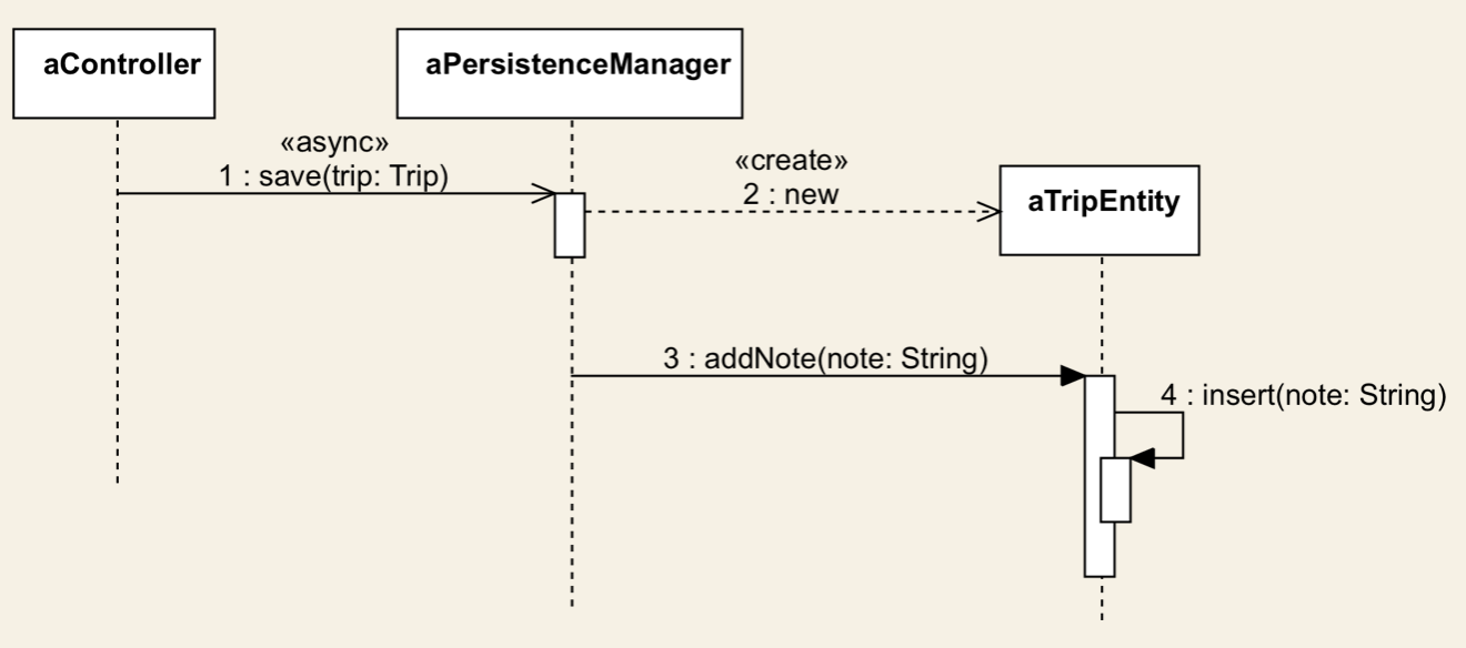 This sequence diagram tells us a lot about the objects and how they interact in the note creation scenario.