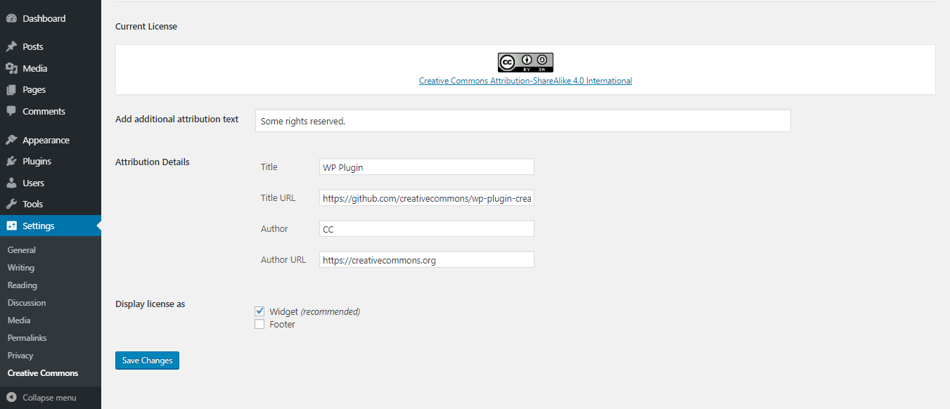 After activating the plugin, head to Settings > Creative Commons to set up the default license.