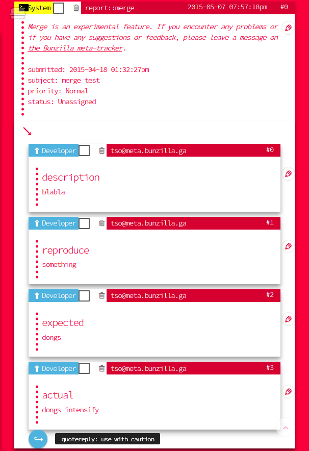 Merging is an experimental feature that takes a report and turns it (and its associated comments) into a quotereply to another report.