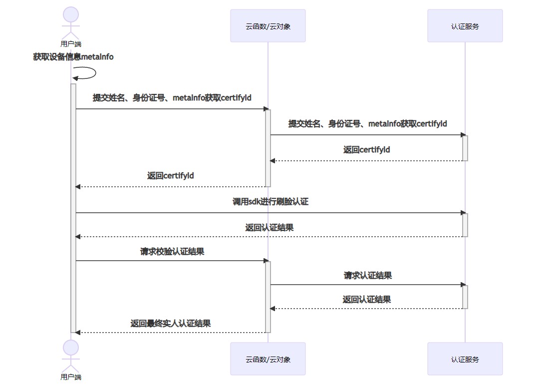 ```mermaid sequenceDiagram actor user as 用户端 participant cf as 云函数/云对象 participant service as 认证服务 activate user user->>+user: 获取设备信息metaInfo user->>+cf: 提交姓名、身份证号、metaInfo获取certifyId cf->>+service: 提交姓名、身份证号、metaInfo获取certifyId service-->>-cf: 返回certifyId cf-->>-user: 返回certifyId user->>+service: 调用sdk进行刷脸认证 service-->>-user: 返回认证结果 user->>+cf: 请求校验认证结果 cf->>+service: 请求认证结果 service-->>-cf: 返回认证结果 cf-->>-user: 返回最终实人认证结果 deactivate user ``` -