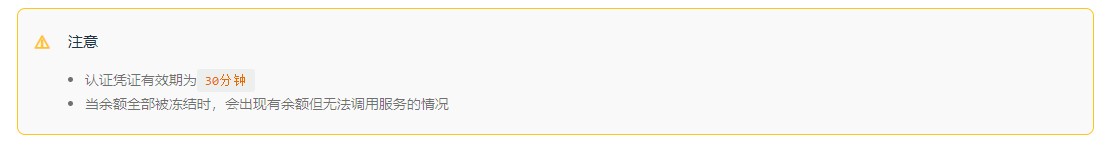info、tip、warning、danger、details(在 IE / Edge 中不生效)详情:::: warning 注意 - 认证凭证有效期为`30分钟` - 当余额全部被冻结时,会出现有余额但无法调用服务的情况 :::
