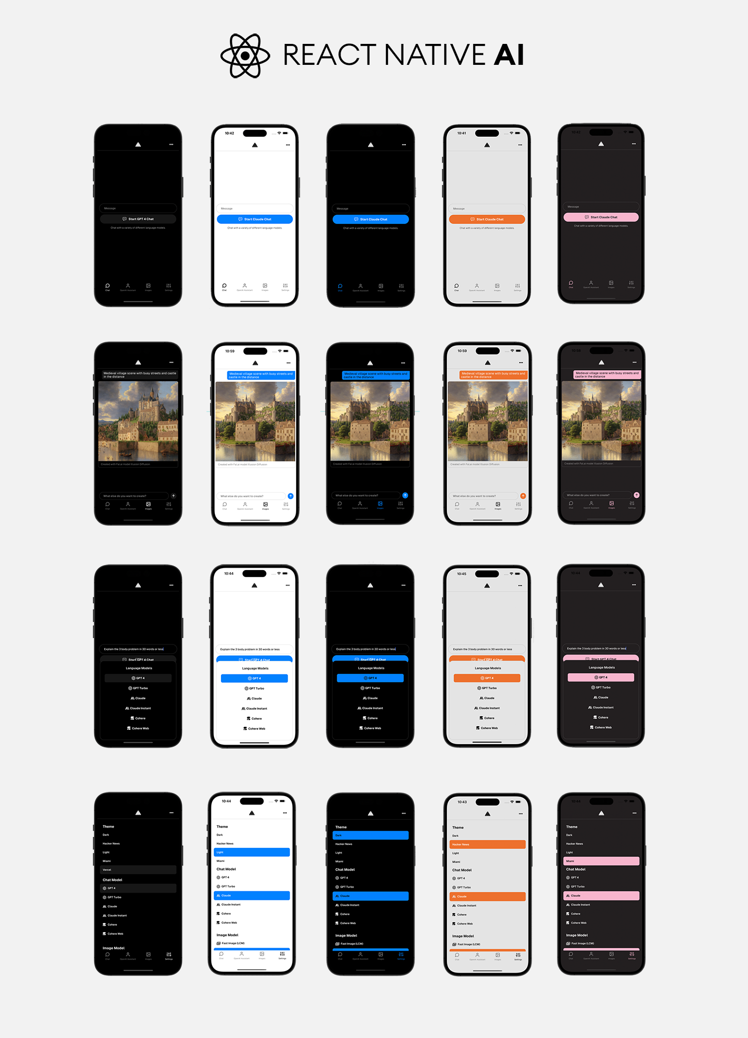 Full stack framework for building cross-platform mobile AI apps supporting LLM real-time / streaming text and chat UIs, image services and natural language to images with multiple models, and image processing.