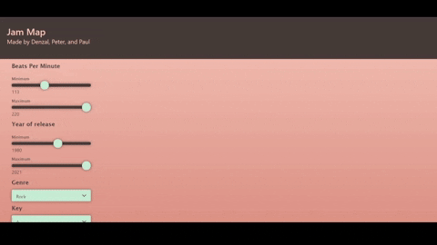 Jam Map is designed around the idea that a user may want to find songs to add to their playlist based on some categorical options (genre and year) or music fundamentals (tempo and key). The goal is to present the user with results that have the same feel as familiar songs and fill out their playlist. The results come with cover art and samples to help the user quickly decide on a song they enjoy.