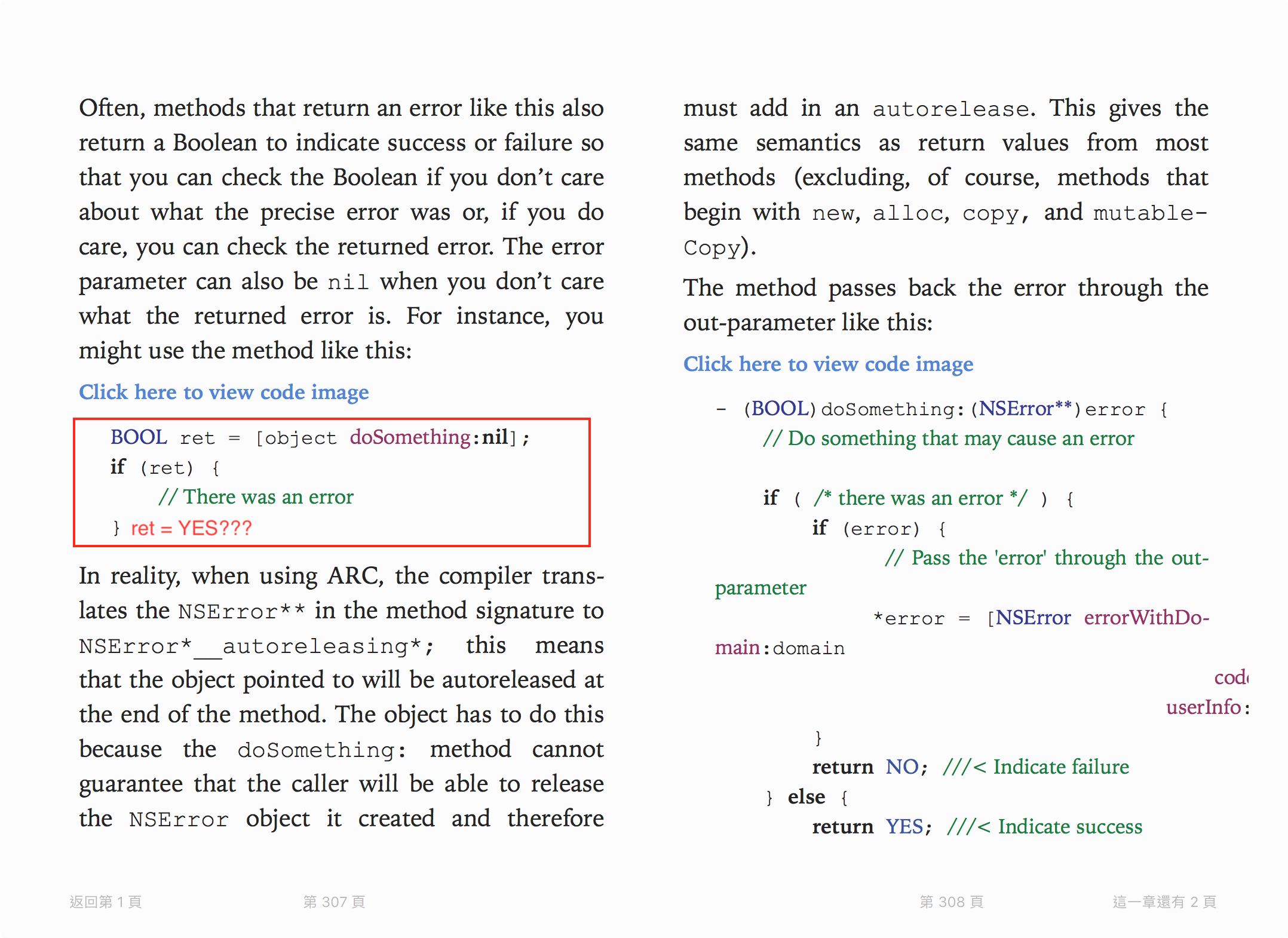 <img width="1078" alt="2018-12-13 1 30 07" src="https://user-images.githubusercontent.com/10362419/49921304-1c920700-fee8-11e8-84b5-e8a9e2af9cbf.png"> About Sample Code as red rect inside, the code maybe below? > BOOL ret = [object doSomething:nil]; > if (!ret) { > //There was an error > }