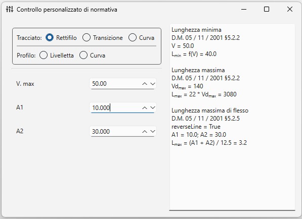 L'applicazione adotta i seguenti criteri per la verifica dell'andamento planimetrico dell'asse stradale.