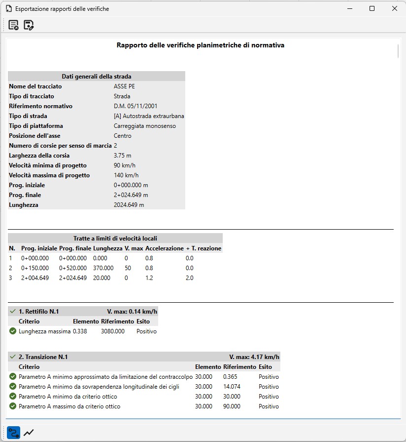 .pdf/.html: riepilogo delle caratteristiche della strada, limiti locali e verifiche planimetriche/altimetriche attive.txt: registro completo di tutti i criteri, inclusi quelli non attivati