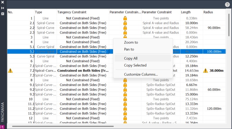 I valori dei parametri Lunghezza, A e Raggio vengono colorati in rosso e affiancati tra parentesi con i relativi valori limite, quando risultano coinvolti in almeno un criterio non verificato. Il valore della sopraelevazione viene colorato in rosso quando risulta superiore a -2.50% senza transizione precedente e/o successiva.