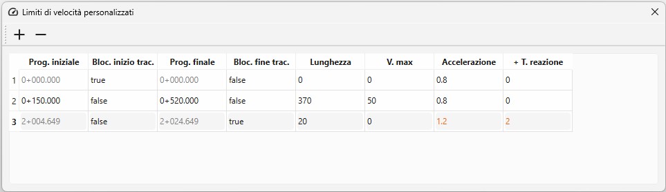 - Nella variazione dei parametri geometrici di input (es. lunghezza, A, raggio) tra due importazioni successive vengono mantenuti i criteri attivi e disattivi dell'elemento solo se mantiene la stessa posizione rispetto al tracciato / profilo. Al primo elemento geometrico che risulta di tipo diverso da quello corrispondente alla sua posizione nella importazione precedente vengono associato di default i criteri di verifica attivati nella finestra delle impostazioni dall'elemento in esame in poi. Ad esempio, se viene esaminato un tracciato costituito dall'insieme di rettifilo-transizione-curva-transizione-rettifilo con una successiva importazione del tracciato modificato a rettifilo-transizione-curva-transizione-curva-transizione-rettifilo, vengono attivati i criteri di default agli ultimi 3 elementi importati -curva-transizione-rettifilo, incluso il rettifilo finale che ha cambiato posizione con l'inserimento della transizione di continuità e della curva policentrica. Eventuali modifiche ai criteri attivati per il rettifilo finale verranno sovrascritte.