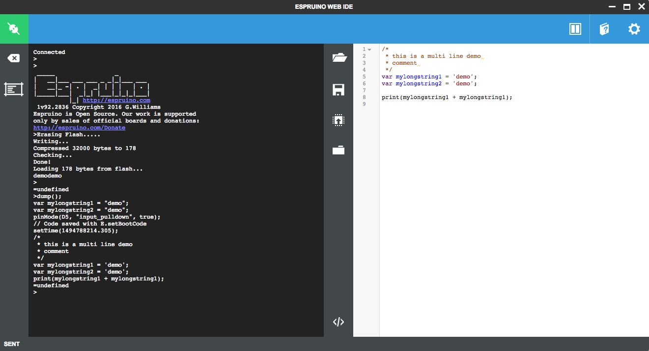 Posted at 2017-05-16 by hungryforcodes Weirdly I tried this on an ESP8266 -- and first the uploaded code was the same size as the IDE code (suggesting it hadn't been minified -- as its usually much smaller by almost 1/3), and then at one point during the upload the board just freaked out with an out of memory error and then a continuous stream of "Execution Interrupted", until the upload failed due to the "Prompt not detected error...". Under communications I had selected upload modules as functions, and then after "Save On Send" was set to "Yes". And under Minification I have both modules and regular code set to simple optimizations using Closure. The board was flashed with a standard v92, using the last official release. |