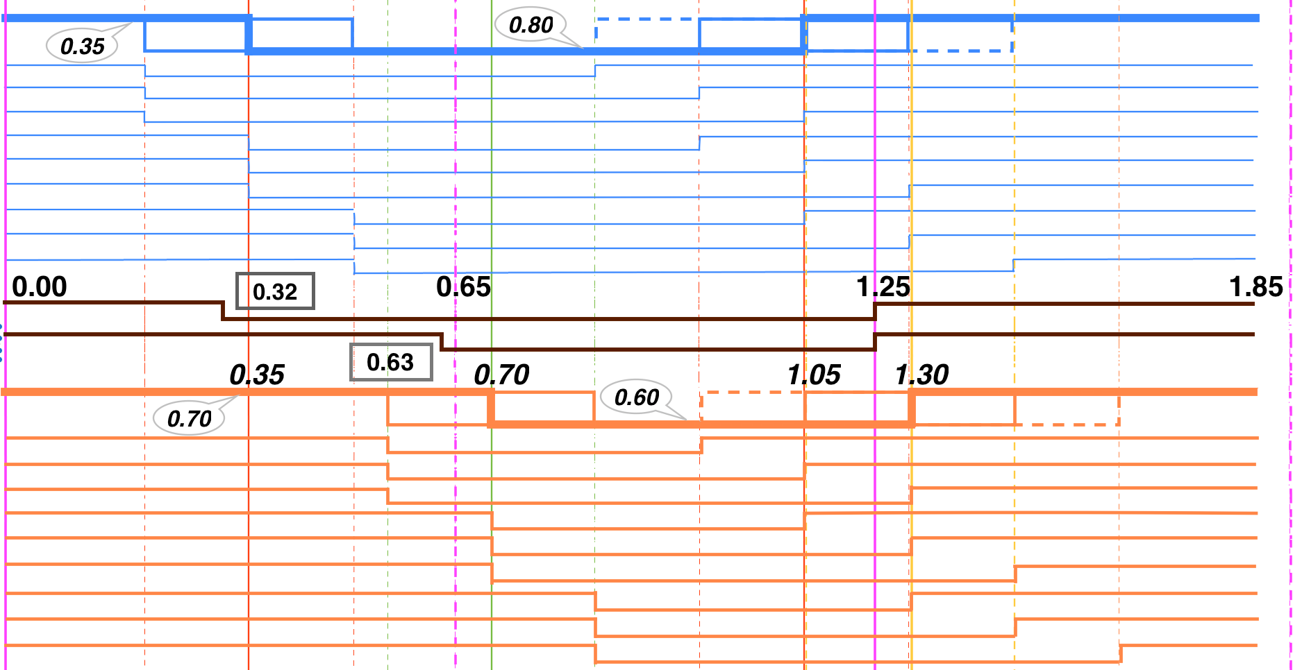 Times are to scale. Numbers are times in [us]. The protocol is quite smart and self-reconditioning takes place between the pixels (by the built-in circuitry). The fat blue and fat orange lines show the exact specified values. The respective fine lines are combinations of minim and maximum allowed values - tolerances - cumulated/cascaded: