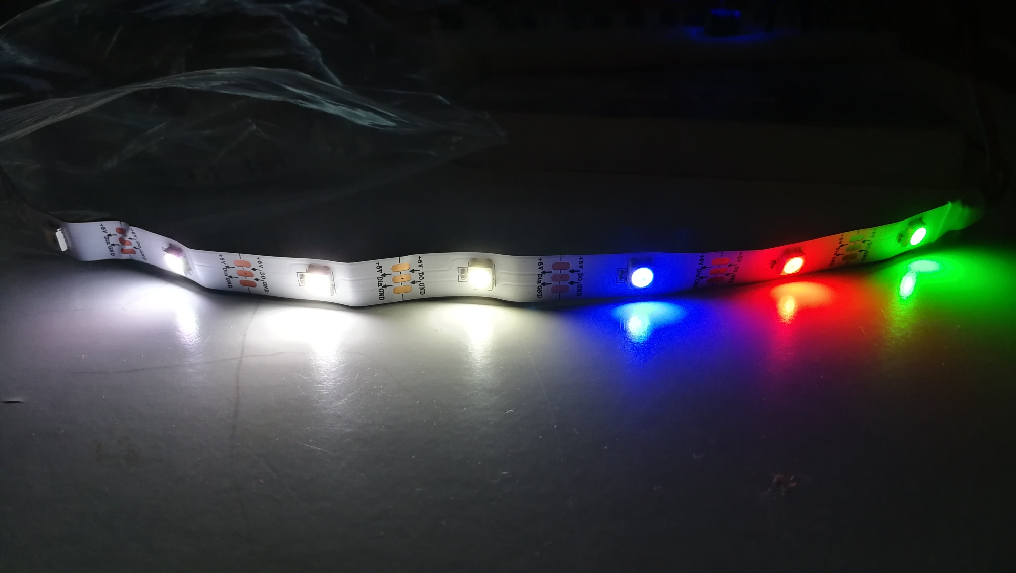 Posted at 2019-02-09 by Robin Fri 2019.02.08 Thank you @AkosLukacs for the source and image from #4 above. @spocki thanks for the trio variant summary: RGBNW (natural white), RGBCW (cold white) and RGBWW (warm white) AkosLukacs, how did you determine that quad Uint's were needed, as the BangGood page specifies RGB+White and also indicates (while incorrect) WS2812 (tripplet Uint's), which you (array divide by three) have proven can't be - see what follows. If a S.W.A.G.'d guess, then it appears you may have gotten lucky there, even though you were led to believe you received WS2812 *Did anyone else observe the inconsistency?* From image in #4 the output as explained is from right to left: (reversed here) Green : Red : Blue : Yellowish White : Bright White : RGB White Spec sheet SK6812 shows RGBW which can't possibly be