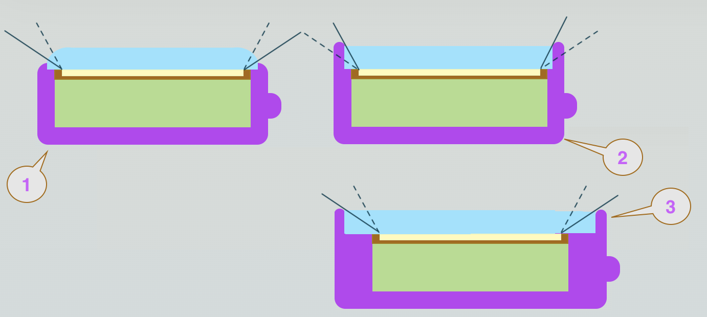 Posted at 2021-10-08 by @allObjects I notice a lot of comparison with Pebble... as much as Pebble was a great thing, afaik, it never had GPS nor was it geared towards being hackable, and therefore it is just like any other smartwatch without GPS . Any watch with GPS that has to look and be not as bulky - withxdepthxheight - as Bangle.js 1 and have has to go with the case, (practical no) bezel and glass in size and shape as Bangle.js 2. Any bezel around the glass requires either the glass to be larger or the view angle is smaller to see the complete face. Attached cross sections of the different options of encasing (purple) the same volume for the electronics (green) - battery, pcb, display, glass (blue) strength, and wide view angel onto the active area (yellow) of the display. It is very obvious that a protected glass comes with a lot of bulk - first height (2) and then, in order to keep the wide viewing angle, also width x depth (3)... A 3D view would would show this even more pronounce. :\Attachments: |