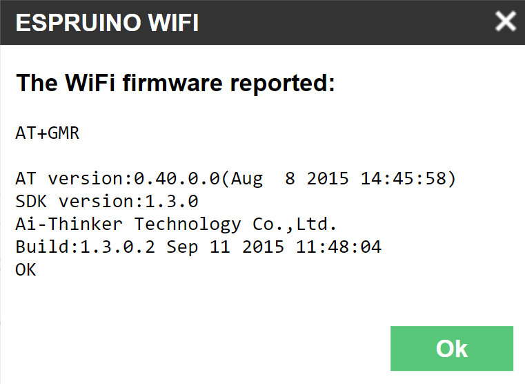 | Posted at 2024-01-06 by Coder2012 I also took some time to try and debug using the following code I saw on another thread: This is the code you said to try: And this is the output Posted at 2024-01-07 by @allObjects I'm surprised that you do low-level communication to the ESP-##/ EX8266 module sitting on the Espruino-Wifi... Your code reminds me of using Pico with an ESP-01. As far as I recall, this is all hidden behind Espruino-Wifi firmware... No need to deal w/ GPIO pins and the like. Take a look at this conversation EspruinoWiFi module builtin? and, for example, at this code example: EspruinoWiFi module builtin? - where Espruino-Wifi connects to the local Wifi and exposes a WebServer / interactive WebPage to control the train; and here is another example... not showing me in the best light, but it shows how to connect Espruino-Wifi and check the ip address your access point w/ DHCP give the connection Espruino/Wifi - getIP() returns undefined but callback receives null,ip. Updating the onboard ESP-## is though a different story... but there is documentation about it... https://www.espruino.com/WiFi (@gfwilliams, ooops, read  Posted at 2024-01-07 by Coder2012 Thank you for the reply, the low-level code above was taken from another post that Gordon commented on, he wanted to see what the wifi module reported back, so just to save time I decided to do the same. The code I am actually running is as follows: The error message is returned here: var t = ` ready AT version:0.40.0.0(Aug  8 2015 14:45:58) // EspruinoWifiCheck.js const t = (n) => { var t = getTime(); t=""+t; const onInit = () => { setTimeout(onInit,999); |  |_ ___ ___ _ ||___ ___ 83.02755451202 wifi connecting... |  |_ ___ ___ _ ||___ ___ 79.02789402008 wifi connecting... 2v19 (c) 2021 G.Williams 42.02763271331 wifi connecting... 2v19 (c) 2021 G.Williams 69.02761077880 wifi connecting... |  |_ ___ ___ _ ||___ ___ 00.02708053588 wifi connecting... 2v18 (c) 2021 G.Williams 15.02713966369 wifi connecting... 2v18 (c) 2021 G.Williams 17.02713966369 wifi connecting... |  |_ ___ ___ _ ||___ ___ 88.02419090270 wifi connecting...  |