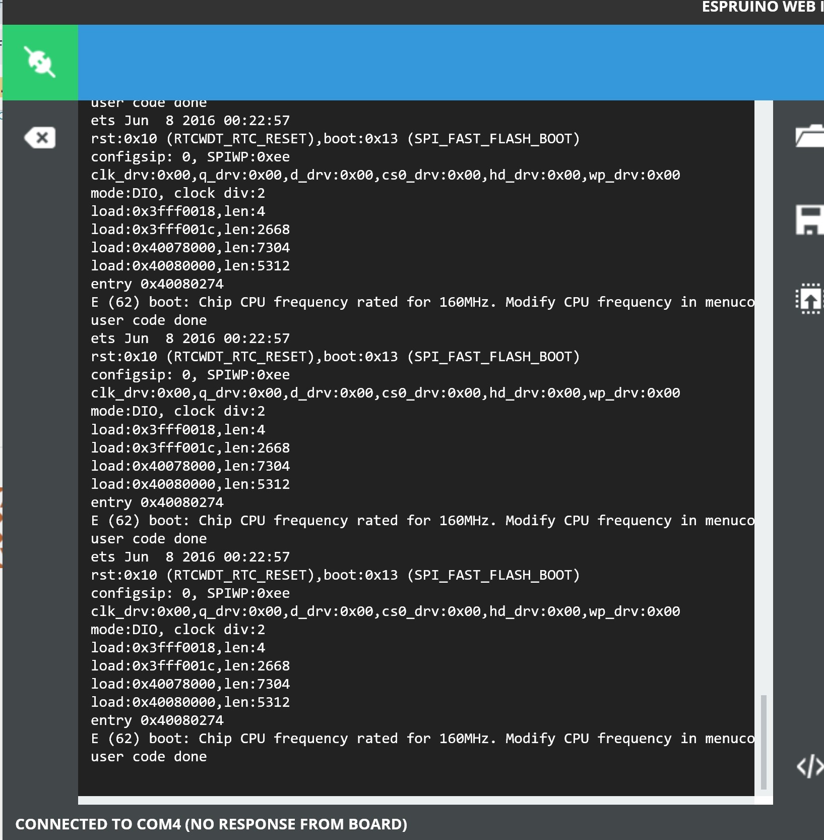 Posted at 2020-04-21 by AkosLukacs What command did you use to flash Espruino? For example the last couple of times I used this command (basically what's in the ESP32 directory, replace COM6 with your com port): Posted at 2020-04-21 by Sdellava I've copied your command replacing only the COM port. This is the output: esptool.py --port COM4 --baud 921600 write_flash -z --flash_mode "dio" --flash_freq "40m" 0x1000 bootloader.bin 0x10000 espruino_esp32.bin 0x8000 partitions_espruino.bin Then using the web IDE I get the result captured in the attached image Attachments: Posted at 2020-04-21 by Sdellava Thanks for the replay. I've answered in the next message. Posted at 2020-04-22 by Lixas I would omit (delete) Posted at 2020-04-22 by Sdellava I've followed your suggestion, but I get the same result: C:\esptool\espruino_2v05.15_esp32> espruino_2v05.15_esp32>esptool.py --chip esp32 --port COM4 erase_flash C:\esptool\espruino_2v05.15_esp32>esptool.py --port COM4 --baud 921600 write_flash -z 0x1000 bootloader.bin 0x10000 espruino_esp32.bin 0x8000 partitions_espruino.bin Leaving... C:\esptool\espruino_2v05.15_esp32> IDE output is identical to the previously uploaded. The fact that flashing with the Arduino IDE and then replacing the bin, the Espruino code boot and work for some seconds before to crash, make me think that the bootloader provided in the Espruino kit is bugged. I've tried some old version with no luck. Can someone share the working kit version? Posted at 2020-04-22 by Lixas your baud rate is still 921600. Lower it to 115200 Posted at 2020-04-22 by Lixas i have found your error: wrong adresses on chip Should be: Posted at 2020-04-22 by Lixas https://www.espruino.com/binaries/espruino_2v05_esp32/ C:\Users\lixas\Workspace\JS\ESP32_Firmware\2v05>esptool.py --chip esp32 --port COM3 --baud 115200 erase_flash C:\Users\lixas\Workspace\JS\ESP32_Firmware\2v05>esptool.py --chip esp32 --port COM3 --baud 115200 write_flash -z 0x1000 bootloader.bin 0x8000 partitions_espruino.bin 0x10000 espruino_esp32.bin Leaving... IMPORTANT: change baud speed at IDE-> Settings-> Communication t0 115200 Attachments: Posted at 2020-04-22 by Sdellava Thanks Lixas, but unfortunately I did not receive the same result. I've tried with lower speed. Tried with different cables and changed the pc's USB port I got always the same boot loop as reported in my upload. May be my board is not a standard one? I've attached a picture. Attachments: Posted at 2020-04-22 by Lixas Mine looks the same. Try to burn Micropython firmware just to be sure. Probably it has something to do with your particular board... Attachments: Posted at 2020-04-22 by Sdellava Update: flashed again with Arduino IDE, then with esptool without erasing (only espruino.bin and partitions) attached the result. It's clear that it work (I've don sum) then it crash for some reason. Attachments: Posted at 2020-04-22 by Lixas This will not help, but at least explain restarting. I see reason is RTCWDT_RTC_RESET - that means somewhere in begining watchdog is set up and board was reset by watchdog. I'm not aware of ways to disable a WDT if it was set up (based on expierence from micropython). In micropython, only way to keep your board running is to WDT.feed() the dog if that was set somewhere. Posted at 2020-04-22 by Sdellava I guess the error comes from the Arduino bootload config/build. But in any case I was not looking to run the Espruino in this way. This is only to show that the bin flashing process works and so there must be a bug in the Espruino bootloader.bin Otherwise I can't understand why with the Arduino boot loader, Espruino boots correctly. Posted at 2020-04-22 by Lixas