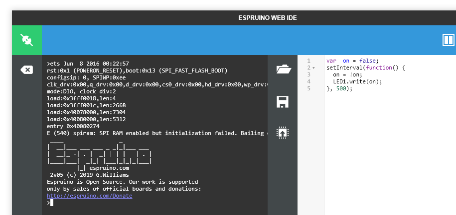 Then I've downloaded the Espruino late release and following the instruction I obtain the continuous boot loop.