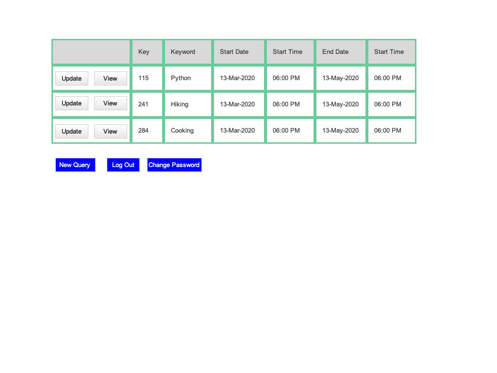 Version 0.2.1 of this application tracks query criteria for events ("event queries"). Event queries can include source (meetup, eventbrite, general), key word, date range, and time range for when you can attend. For example, you can specify that you are looking for Python events that occur within the next month between 6 and 9 PM.