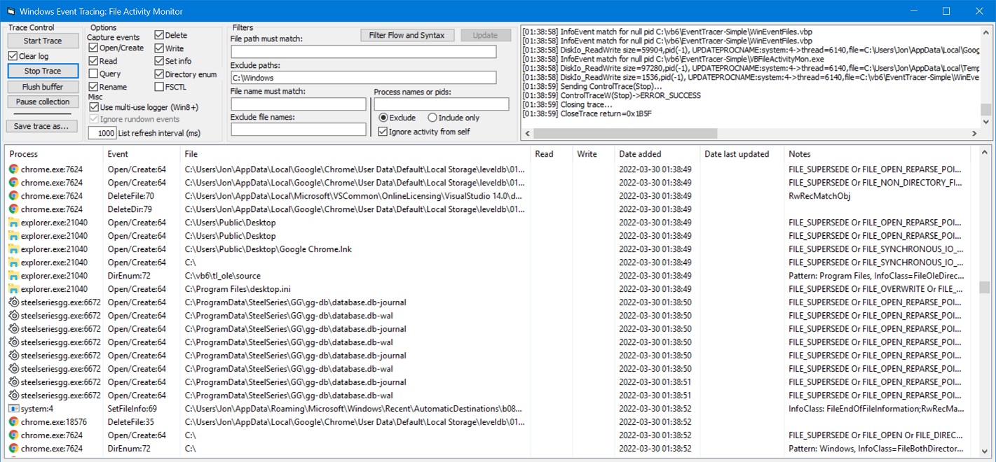 This project tracks most of the DiskIO events and (FileIo events, providing a great deal of control over what events you watch and filtering them to find what you're looking for. It also looks up name and icon of the process that generated the activity (not always available). With no filtering or only light filtering, a tremendous amount of data is generated. The VB TextBox and ListView simply could not keep up with the rapid input, and all sorts of memory and display issues ensued where text and List Items disappeared. So while the project was already complicated to begin with, the only way to cope with this was to use an API-created Virtual ListView (created via API and using the LVS_OWNERDATA style so it only includes the data currently being displayed). The default mode looks only at DiskIO events, which represent physical disk activity, many FileIO events are only on in-memory caches. It's advisable to select 'Supplement', which uses info from FileIO events to correlate process attribution information, which is often missing from events.