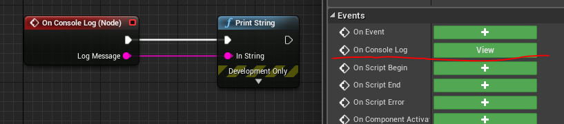 console.log('started');On the blueprint side, our scripts start on begin play (a toggleable property on the node component) and has an event called OnScriptBegin. We use that event to bind to the result event first and then emit a vector2d with x and y float values and convert it to a SIOJsonValue, this will autoconvert to a json object in your script side.