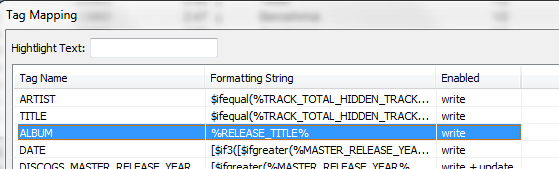 I think that you have these terms wrong. This means that if you want to always keep your current values for a certain tag, you'll make it only "write" in that dialog. So try changing ALBUM to "write + update" - it should do what you're looking for. |
