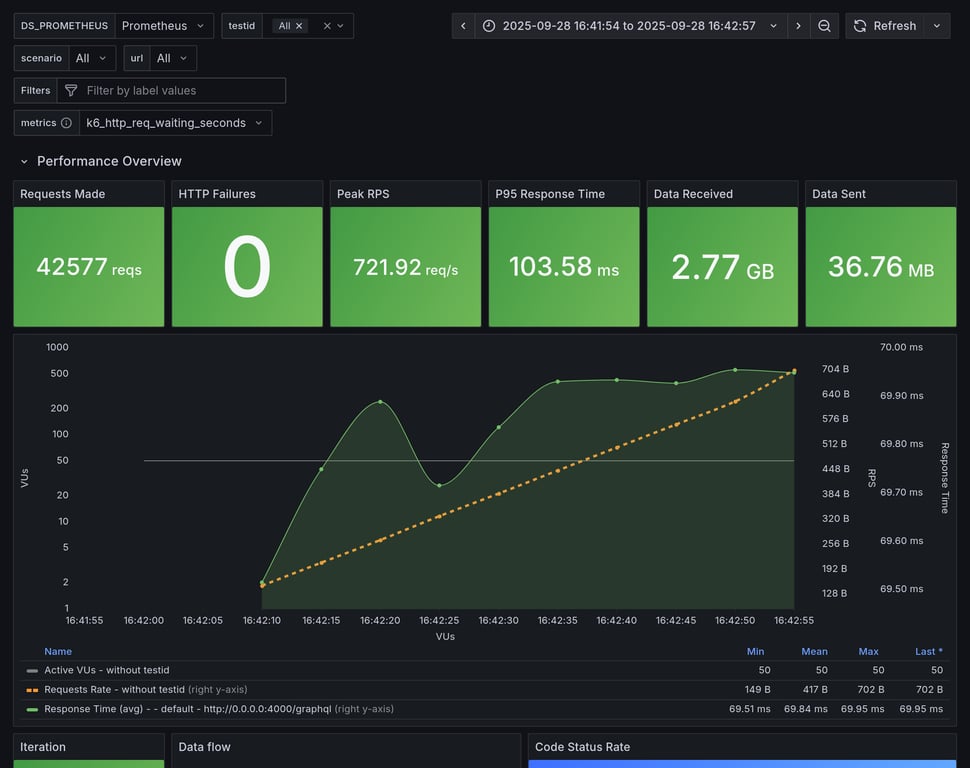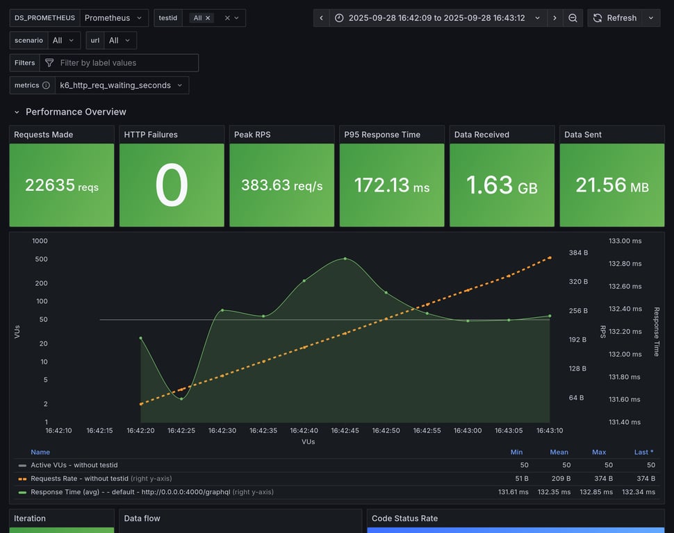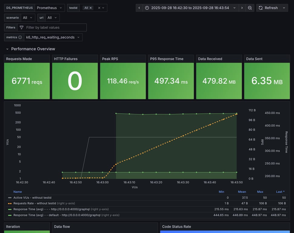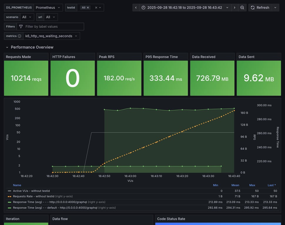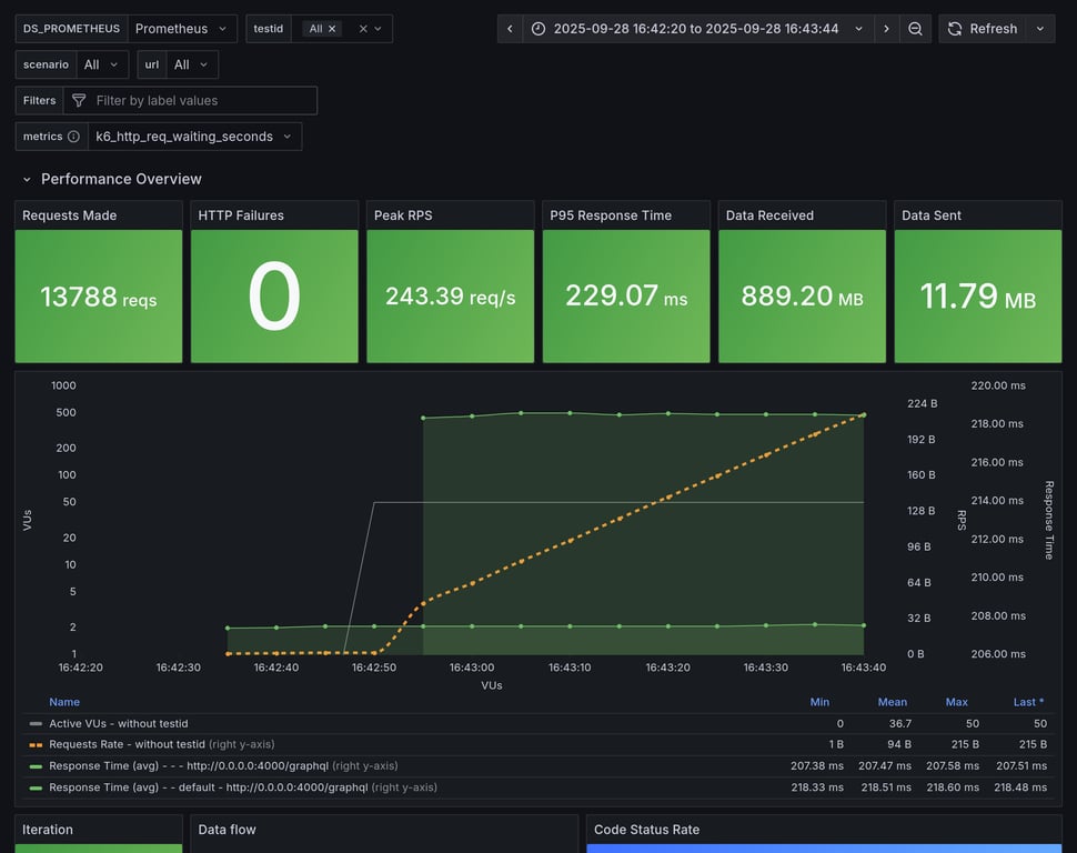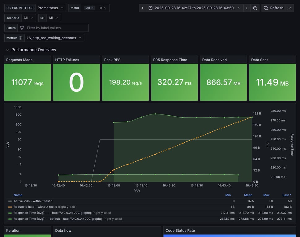 apollo-router | 390 | 26168 total, 0 failed | avg: 538ms, p95: 1208ms | ❌ 20 unexpected GraphQL errors |