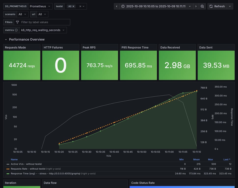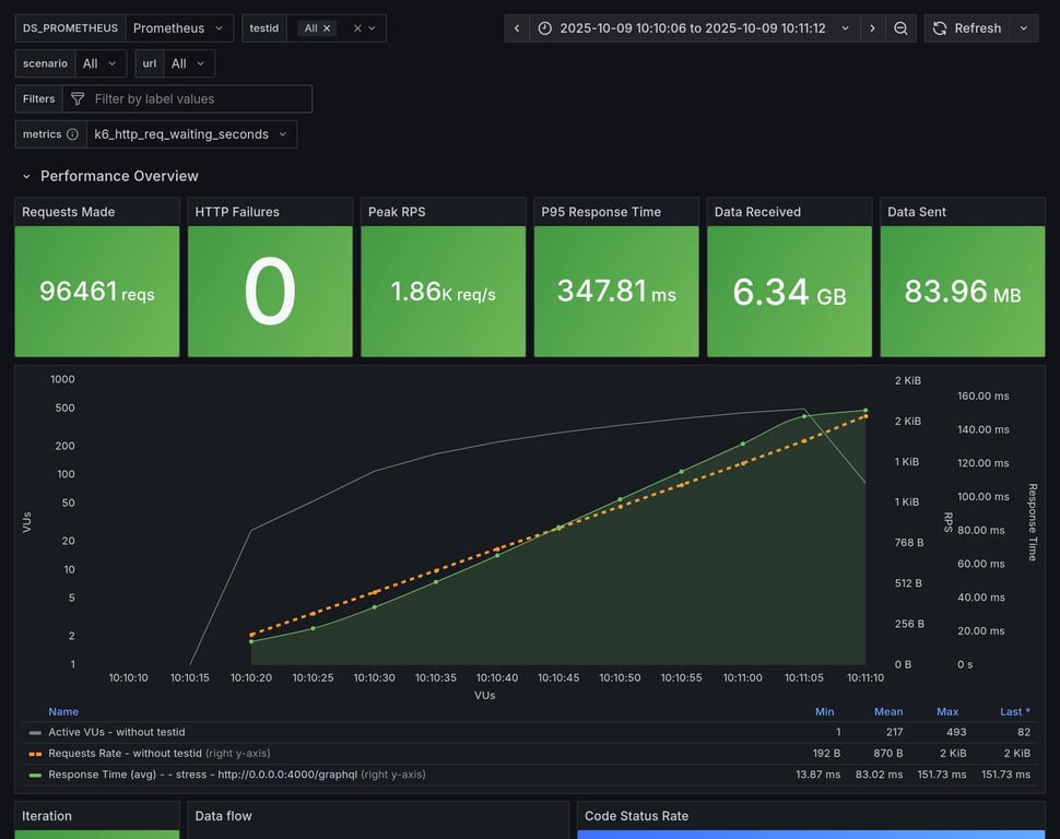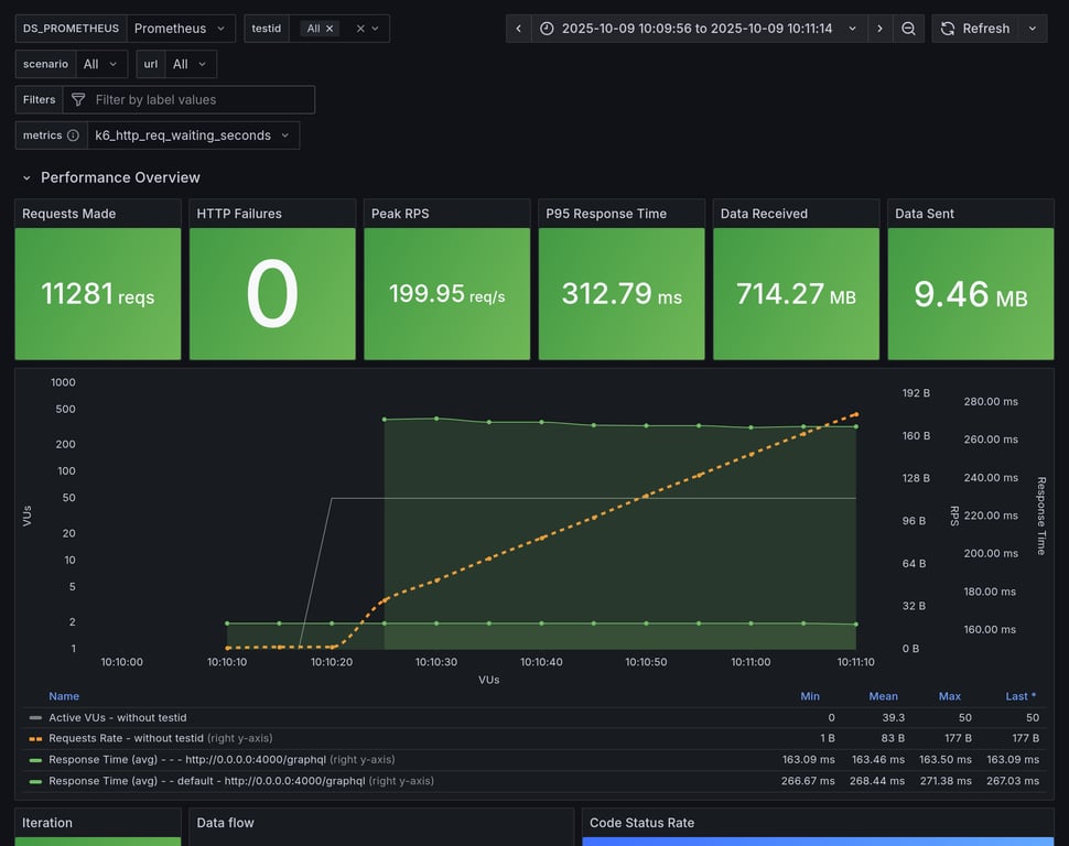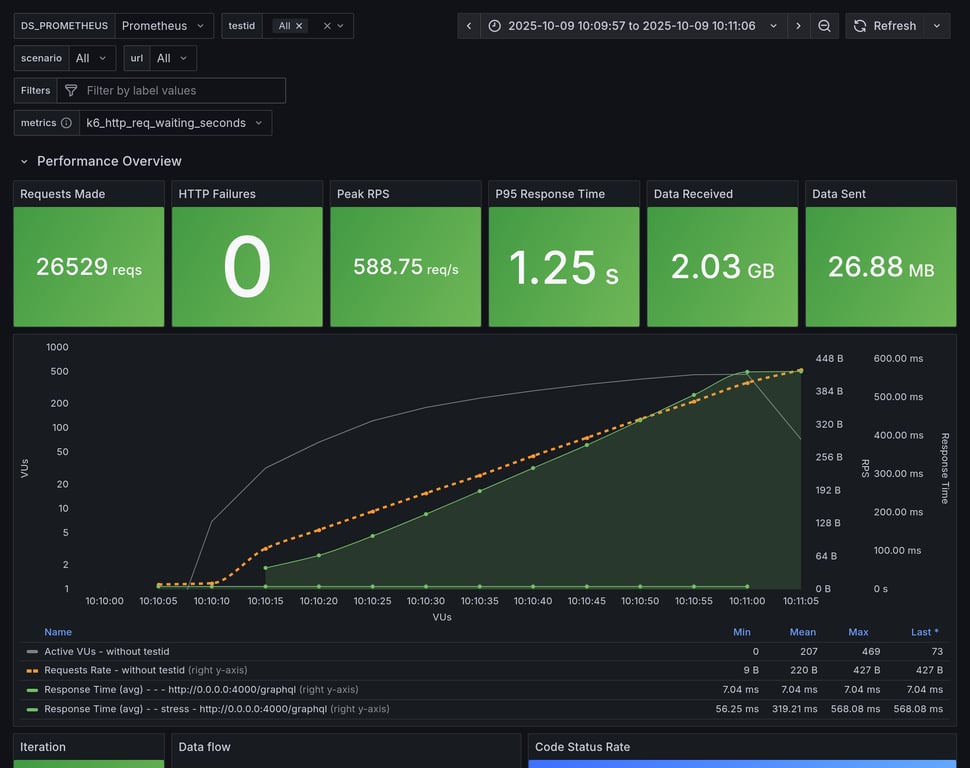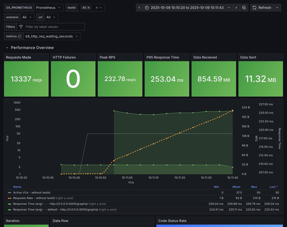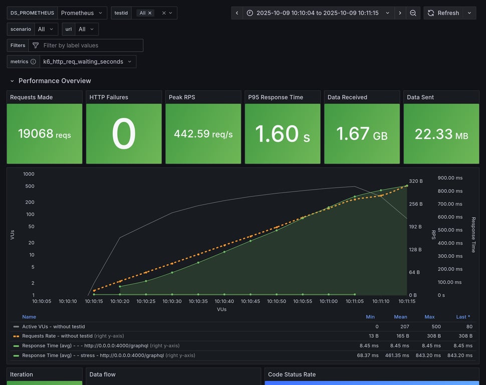 apollo-gateway | 150 | 10356 total, 0 failed | avg: 1248ms, p95: 2687ms | ✅ |